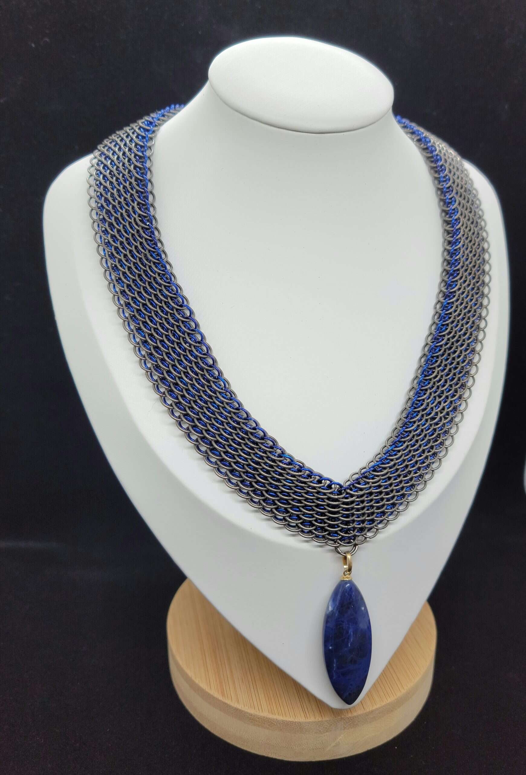Finished with a deep blue sodalite pendant, this piece channels arcane elegance with a distinctly modern edge. At 18 inches long and approximately ½ inch thick, it sits comfortably at the collarbone, making it a powerful statement for everyday wear, cosplay, or fantasy-inspired fashion.