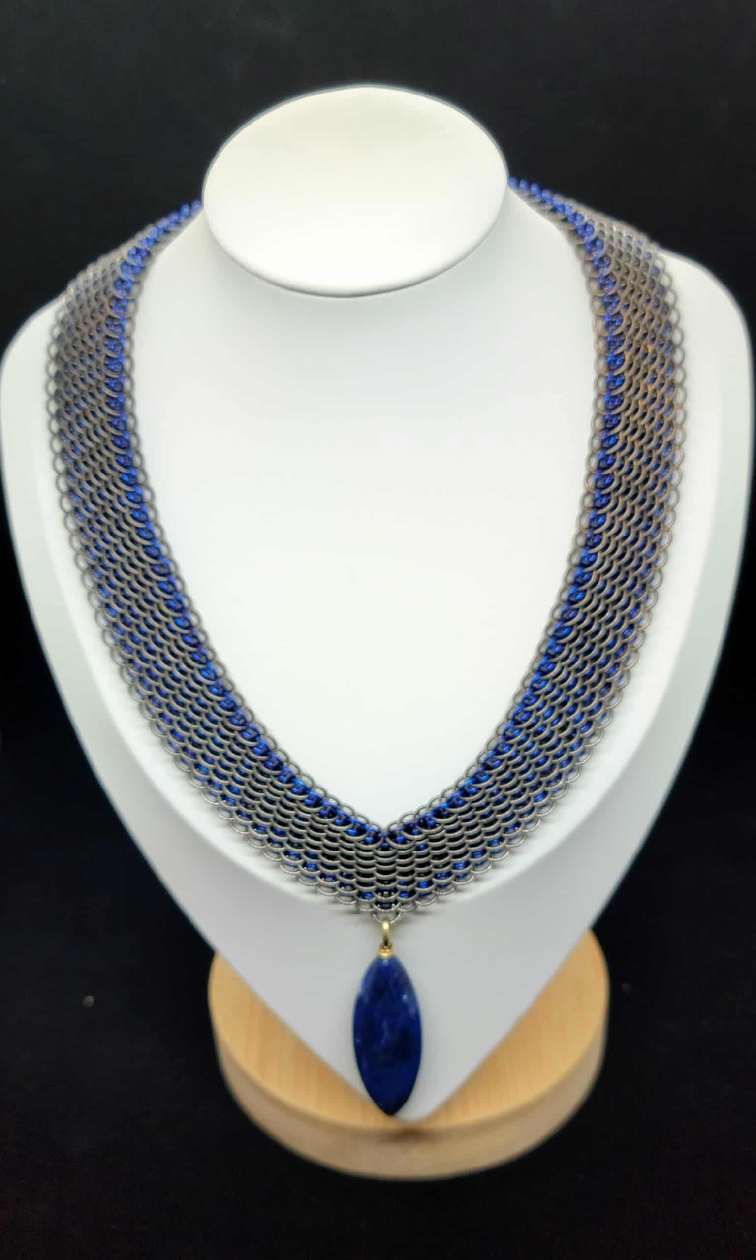 This striking Dragon Scale on the Bias chainmaille necklace is handcrafted from black stainless steel and cobalt blue anodized aluminum, creating a flowing, scale-like pattern that shifts with light and movement. The bias weave gives the necklace a natural drape and a bold, armor-inspired presence without sacrificing comfort.