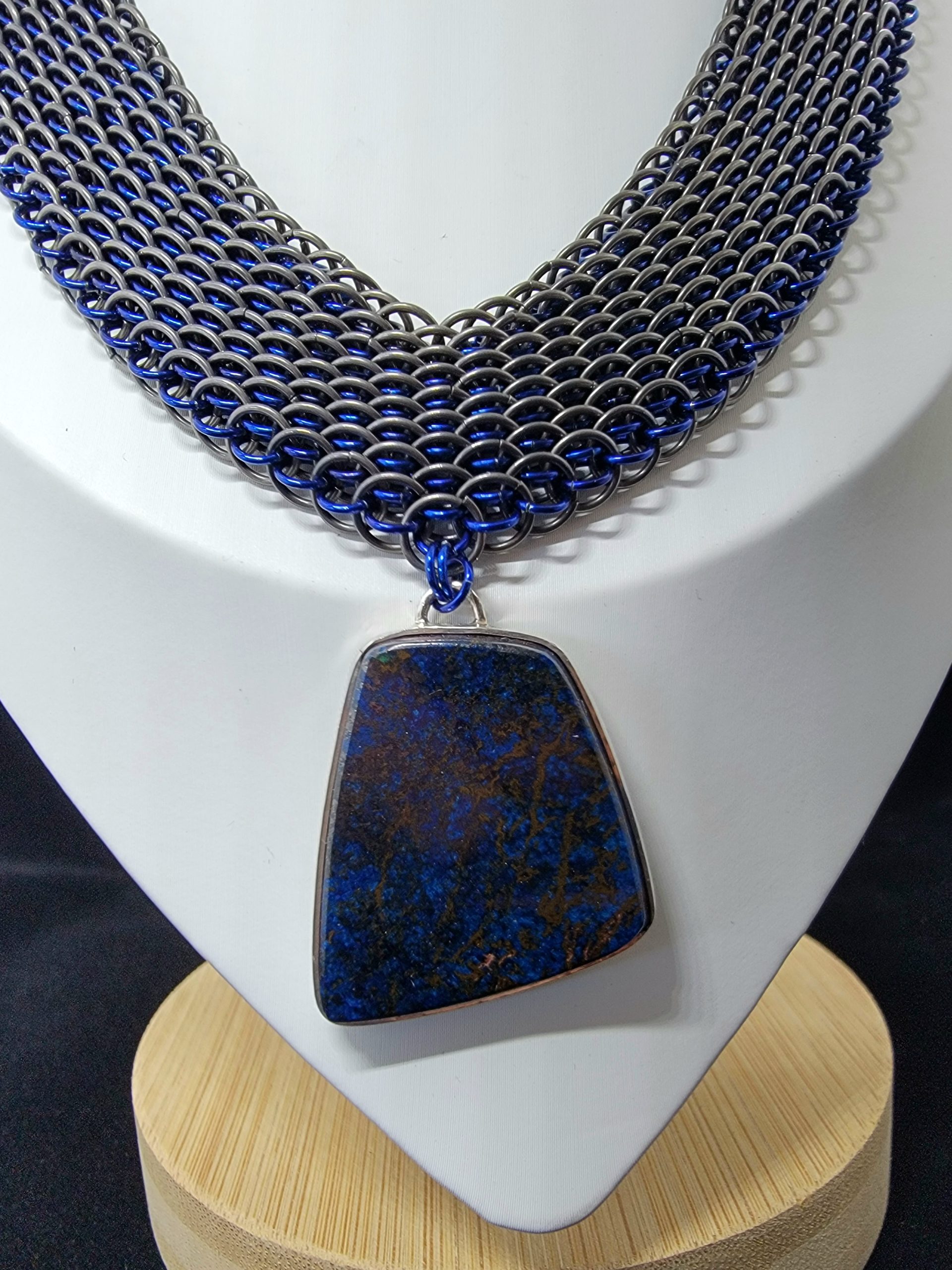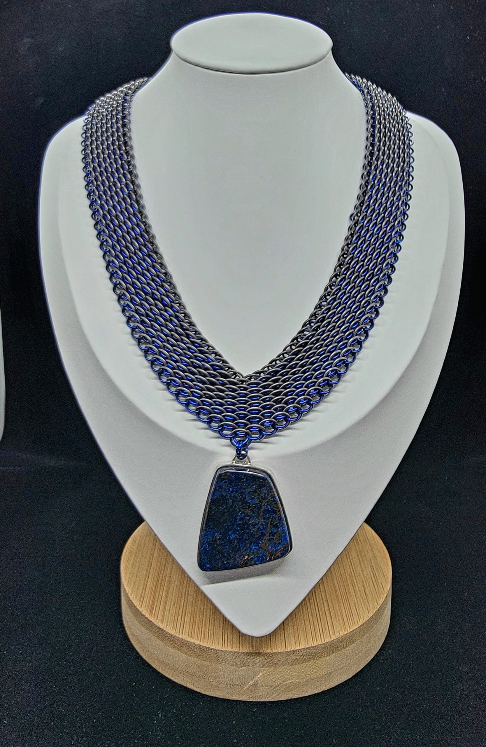 Make a statement with this 18” Dragon Scale on the Bias necklace! Handcrafted in 1-inch-thick cobalt blue and black stainless steel, it’s finished with a stunning covellite pendant that catches the light with every movement. Perfect for fantasy fans, tabletop gamers, and chainmaille collectors, this bold necklace adds a touch of mystical elegance to any outfit.