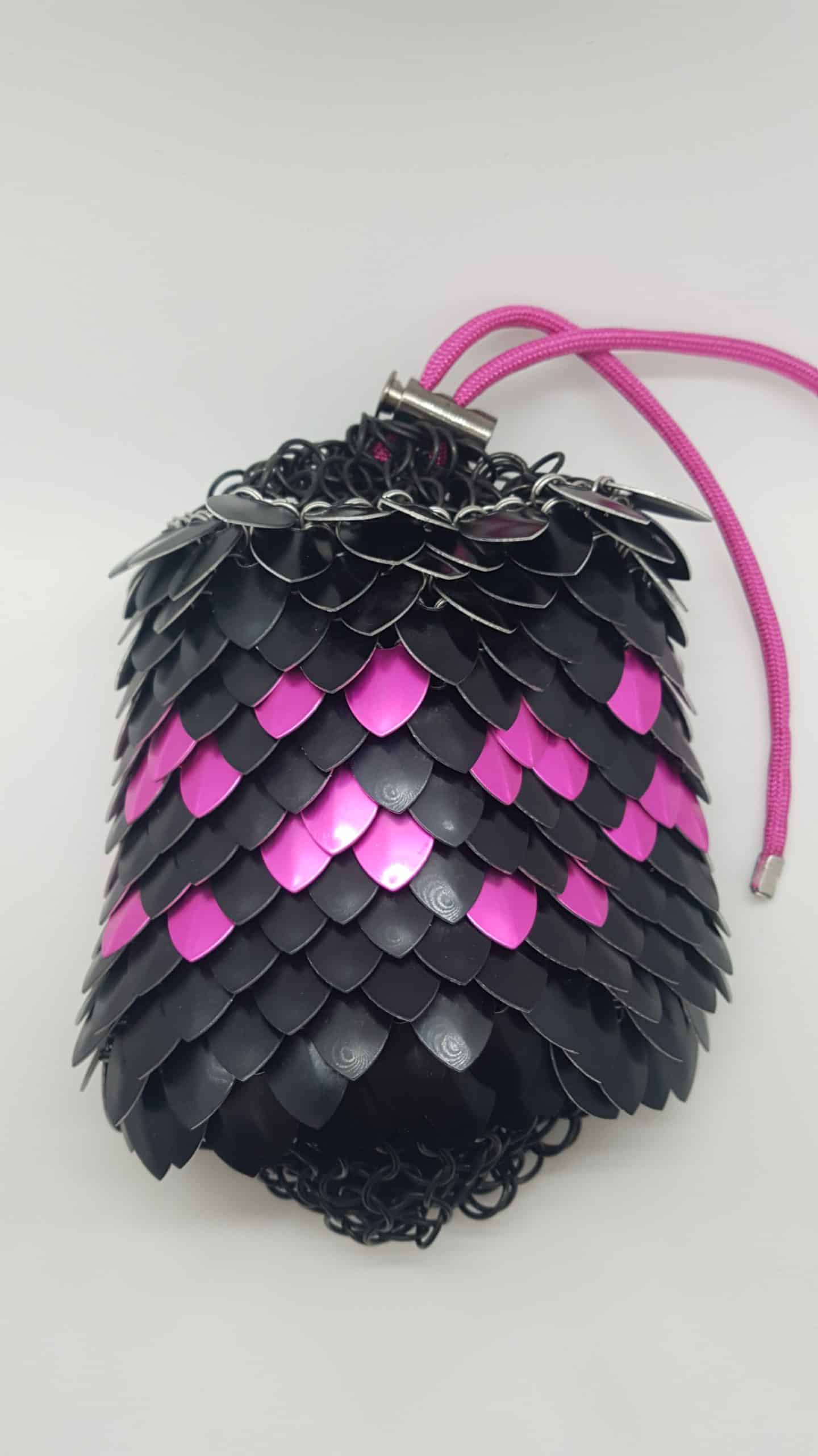 Black and Pink anodized aluminum scale dice bag is as sharp looking as it is practical. Constructed from hard temper anodized scales and stainless steel split rings for the sides and European 4-1 mesh using Anodized Aluminum rings for the tops and bottoms. It comes with a durable paracord drawstring, metal cord lock, and metal cord ends. Bag has a interior liner make of high quality vinyl faux leather. Holds approx 30 standard polyhedral dice. *Dice not included