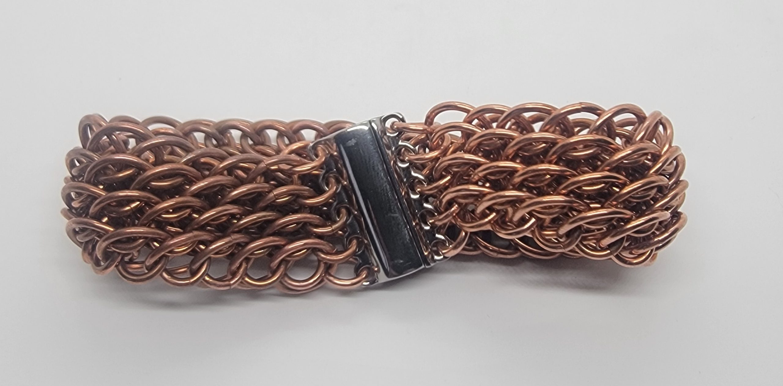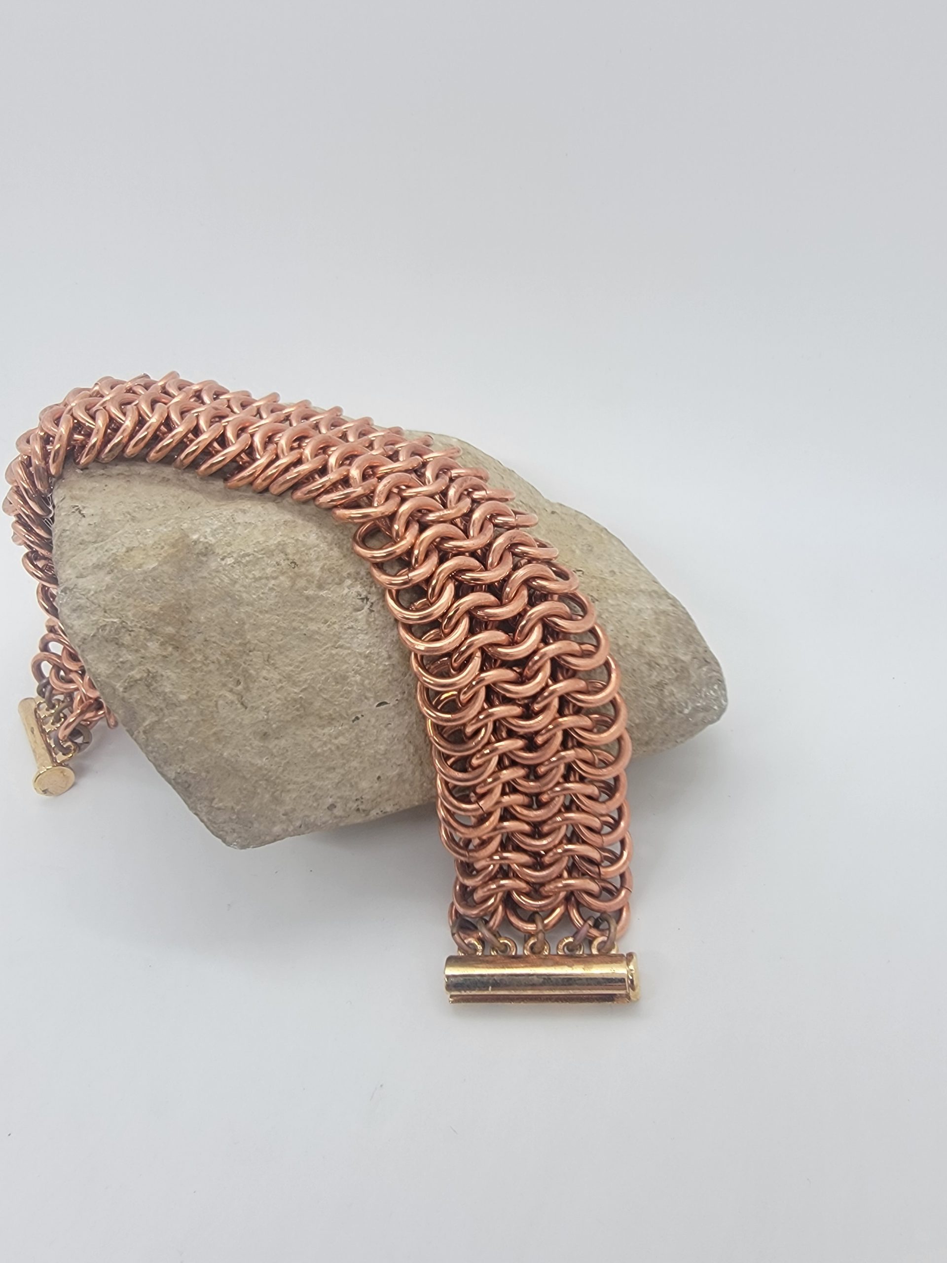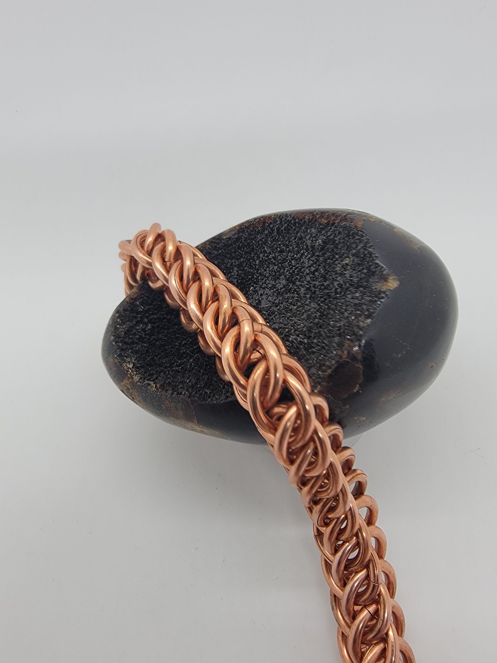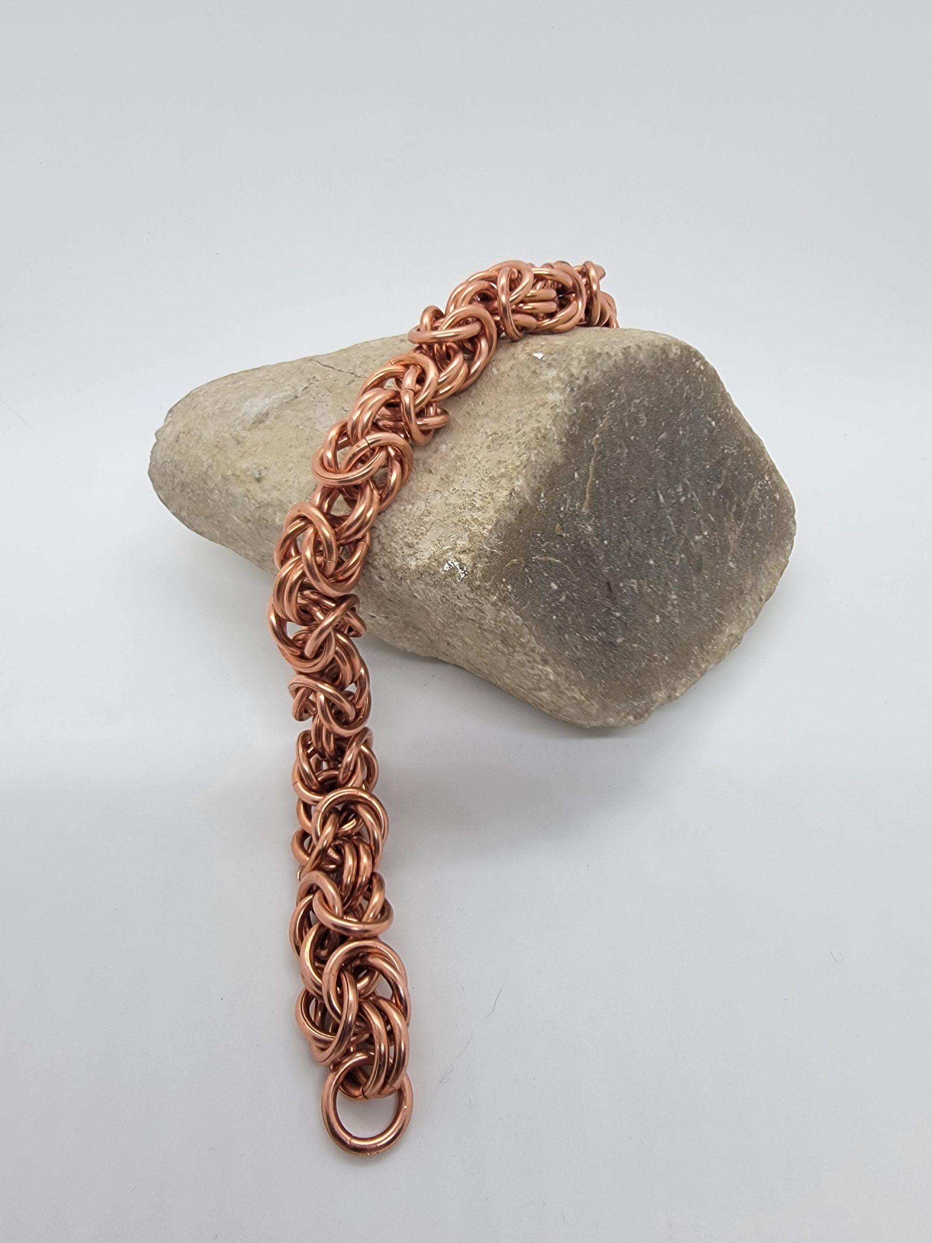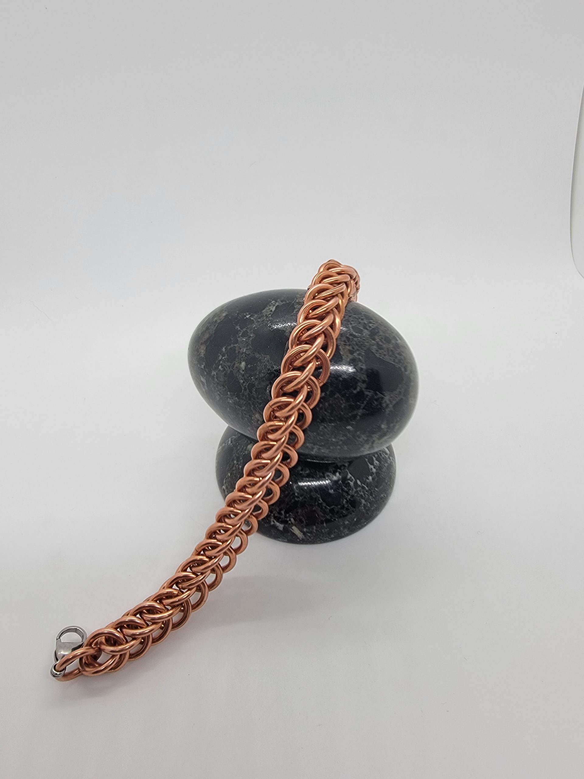 Explore solid copper chainmaille bracelets in a variety of weaves and styles. Handwoven for durability and comfort, these pieces showcase copper’s natural warmth and its evolving patina over time. The warm copper finish brings out the sculptural details of the weave and will naturally develop a rich patina over time.
