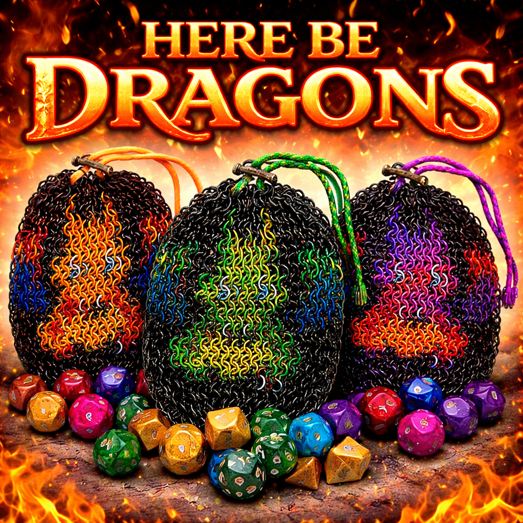 Each Dragon Inlay Dice Bag is hand-woven in chainmaille, with a bold dragon motif rising from a field of rings like a sigil pulled from legend. Built to carry your hoard of polyhedral treasure, these bags blend durability with unmistakable presence. Every piece is crafted ring by ring, with colorways inspired by elemental breath, arcane scales, and the long memory of wyrms. Whether perched at the table or hanging at your side, this is not just storage. It is a declaration.