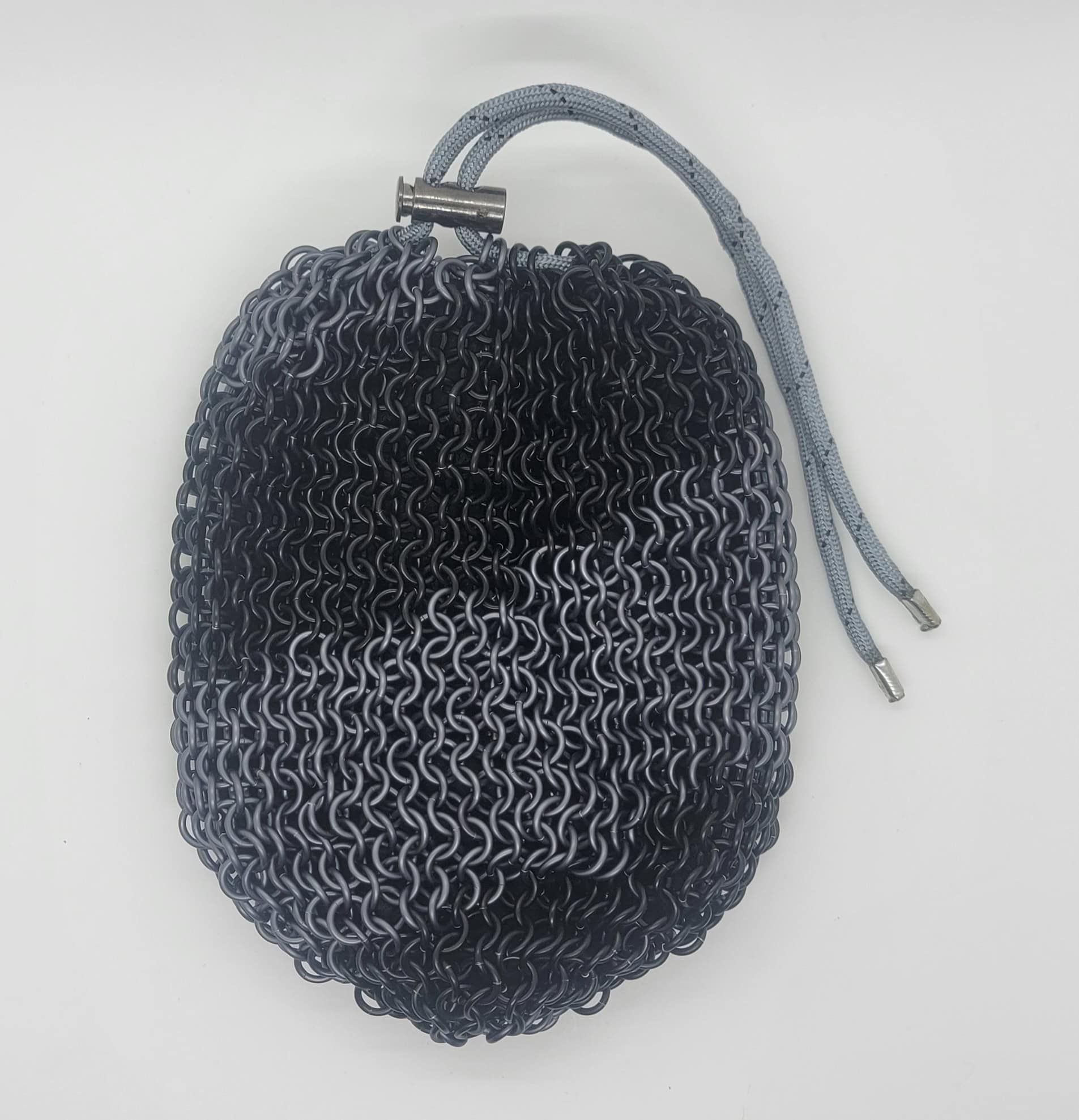 Grey and black spiraling rings make up this bag. Constructed from hard temper anodized rings in a European 4-1 mesh. It comes with a durable paracord drawstring, metal cord lock, and metal cord ends. Holds approx. 90 standard polyhedral dice. *Dice not included