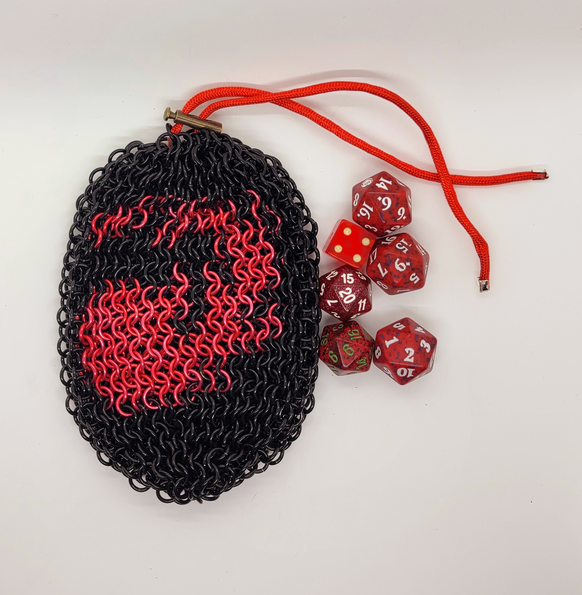 As any wizard will tell you “I didn’t ask how big the room was. I said I cast fireball”. Constructed from hard temper anodized rings in a European 4-1 mesh. It comes with a durable paracord drawstring, metal cord lock, and metal cord ends. Holds approx. 90 standard polyhedral dice. *Dice not included