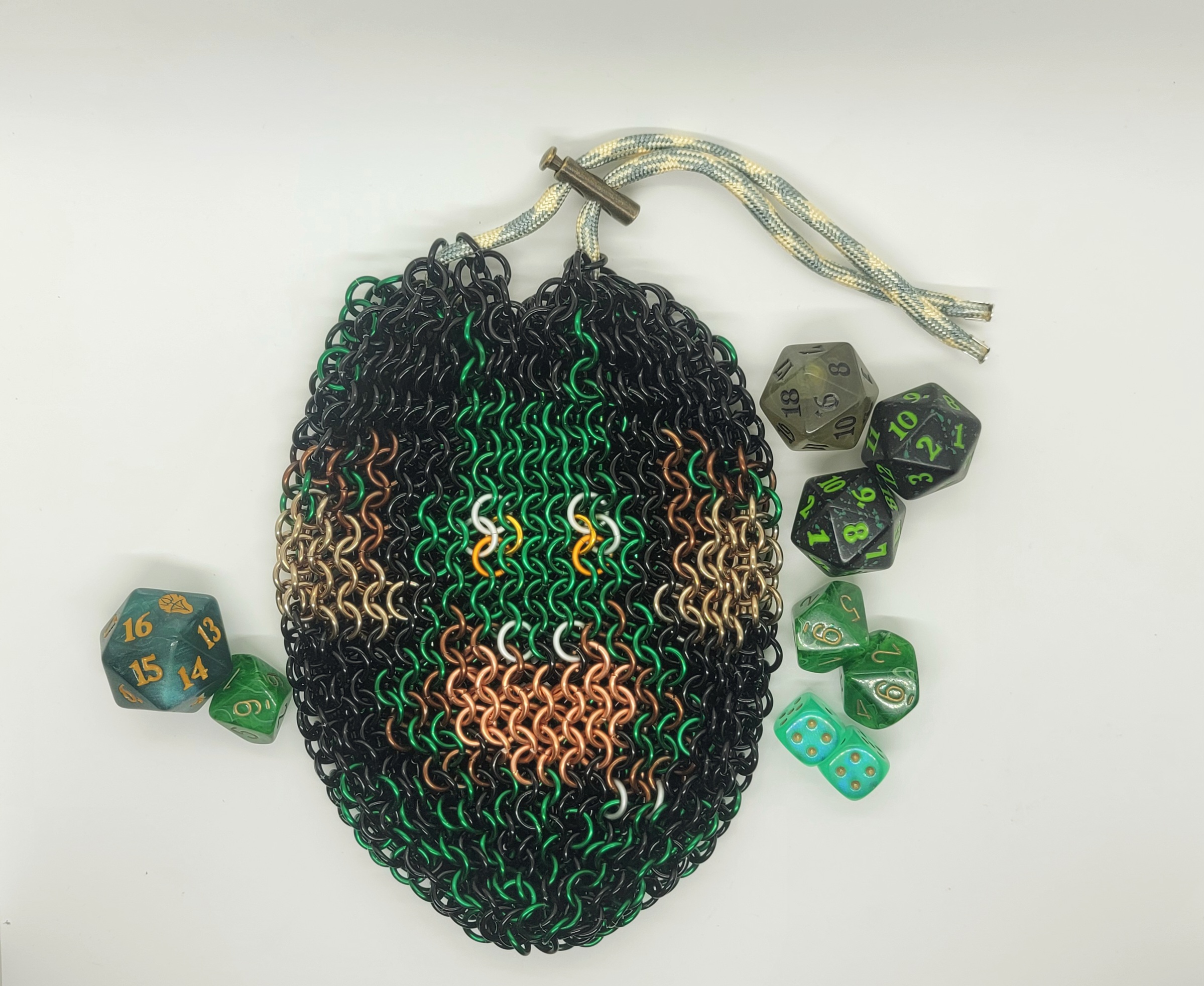 This anodized aluminum ring dice bag carries the most frightening and legendary of mythological creatures. The green dragon is a fierce and mighty protector of your precious dice hoard. Constructed from hard temper anodized rings in a European 4-1 mesh. It comes with a durable paracord drawstring, metal cord lock, and metal cord ends. Holds approx. 90 standard polyhedral dice. *Dice not included