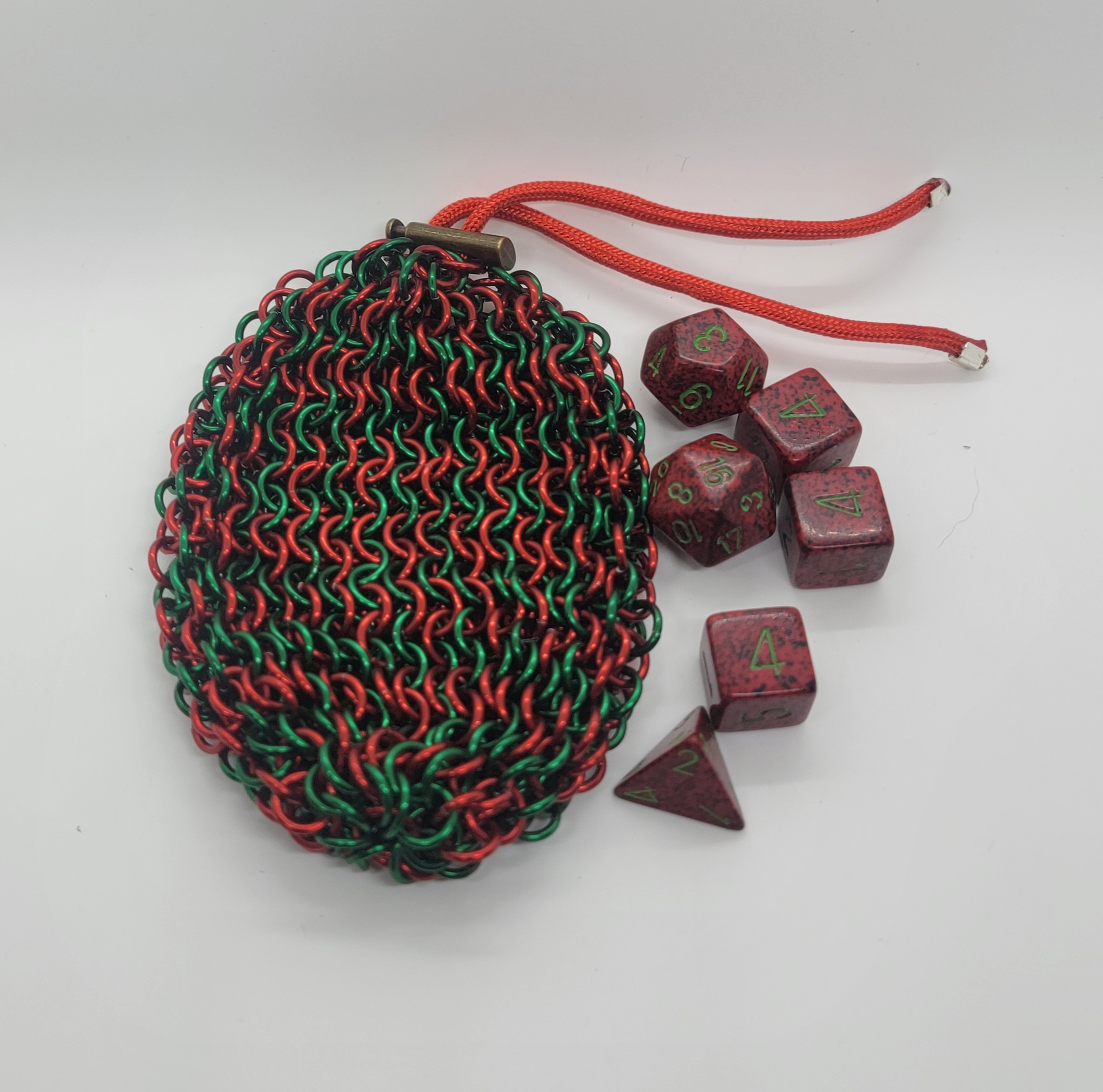 Who says red and green don’t go together? Whether your a fan of Christmas, warrior of Gruul, or fan of Aztec art this is the bag for you. Constructed from hard temper anodized rings in a European 4-1 mesh. It comes with a durable paracord drawstring, metal cord lock, and metal cord ends. Large/Small holds approx. 90/30 standard polyhedral dice Small bag shown in photo. *Dice not included