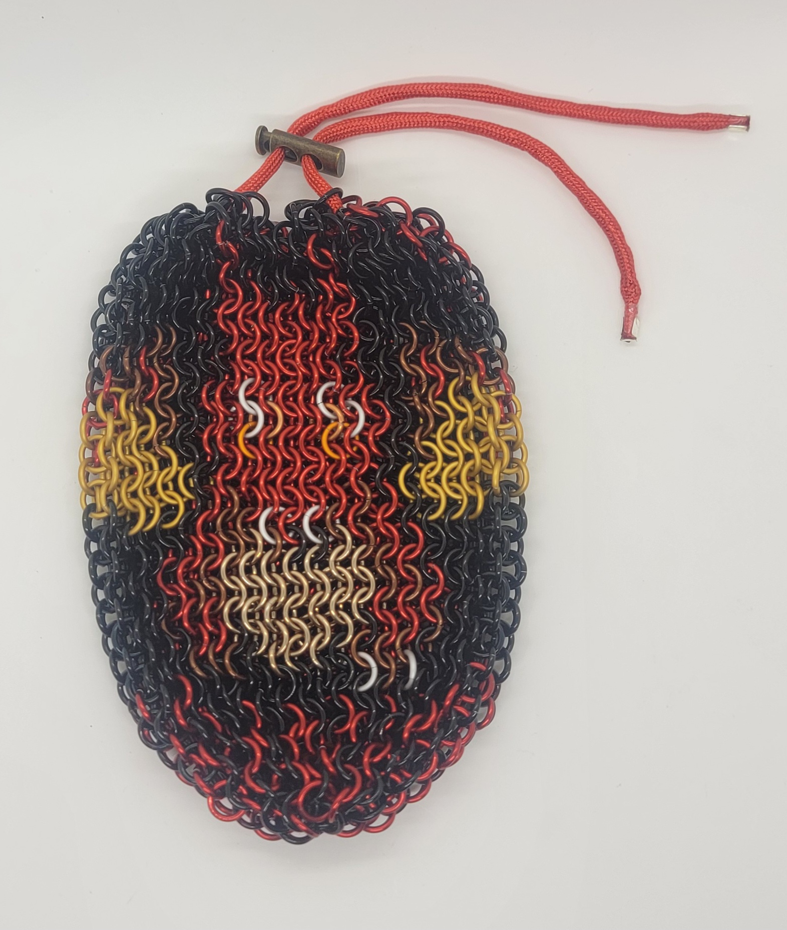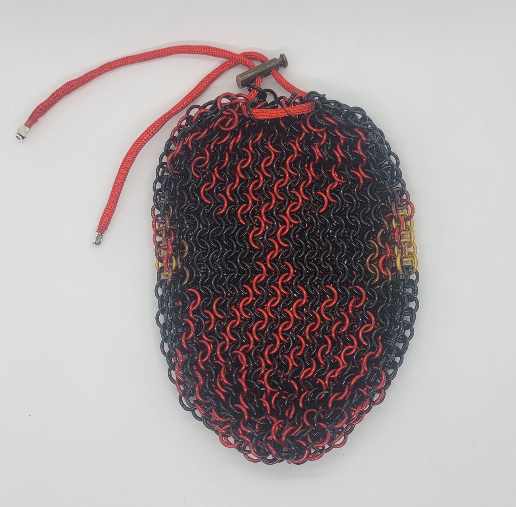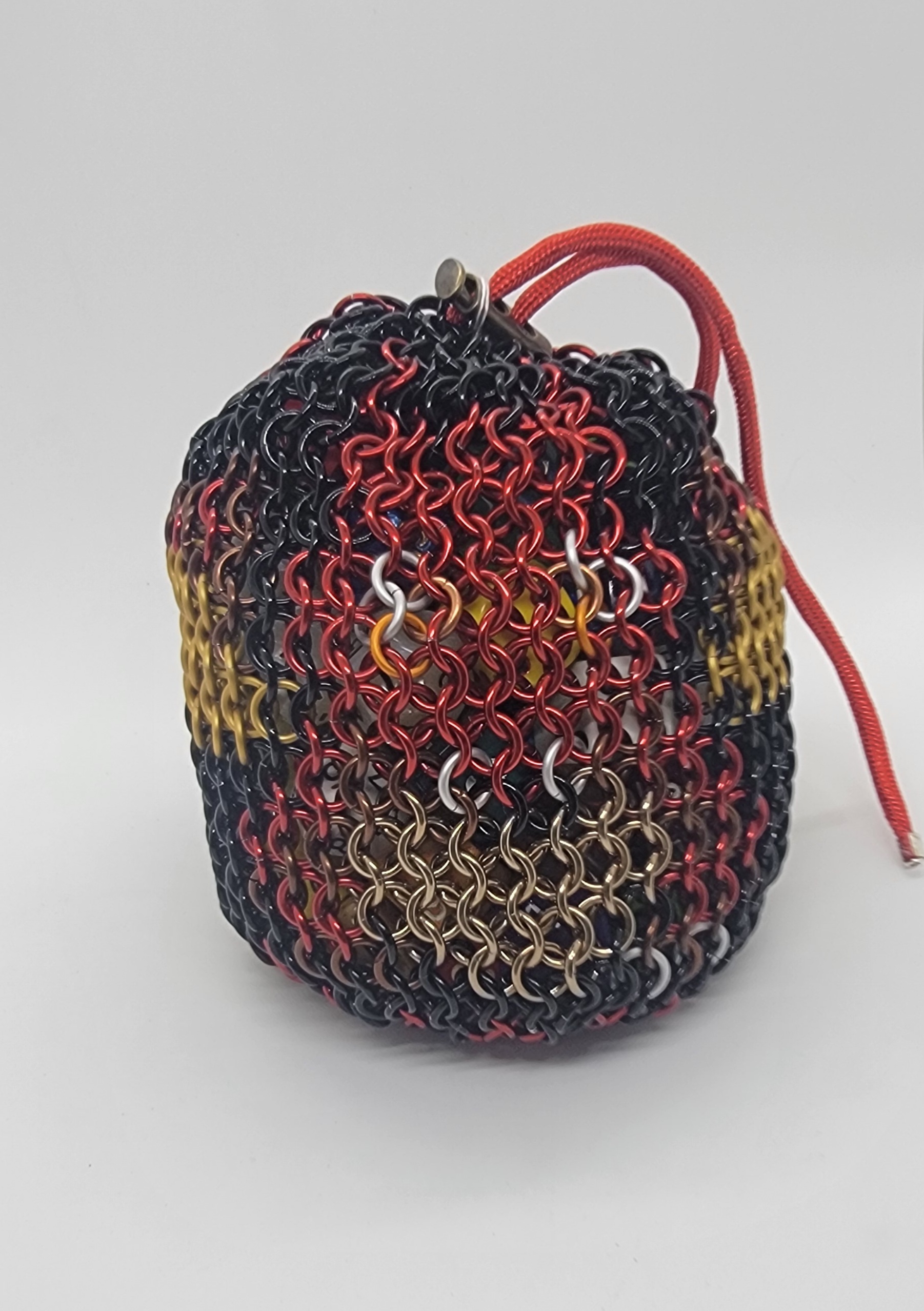 The Red Dragon anodized aluminum ring dice bag is ready to protect your precious and slag any unruly dice that don’t roll your way. Constructed from hard temper anodized rings in a European 4-1 mesh. It comes with a durable paracord drawstring, metal cord lock, and metal cord ends. Holds approx. 90 standard polyhedral dice. *Dice not included