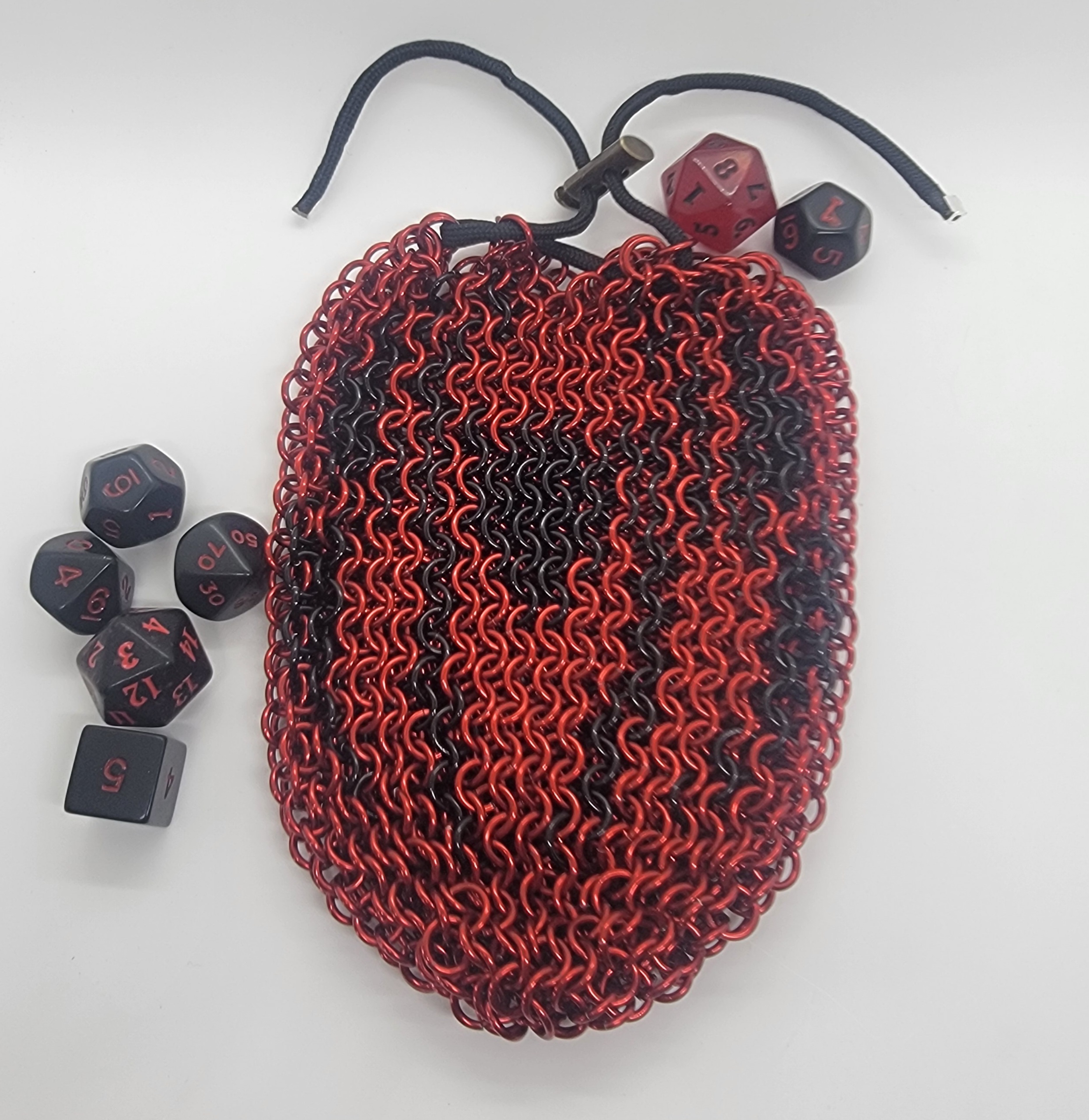 Black and red anodized aluminum ring dice bag is as great piece for any fan of our eight legged friends. Constructed from hard temper anodized rings in a European 4-1 mesh. It comes with a durable paracord drawstring, metal cord lock, and metal cord ends. Holds approx. 90 standard polyhedral dice. *Dice not included