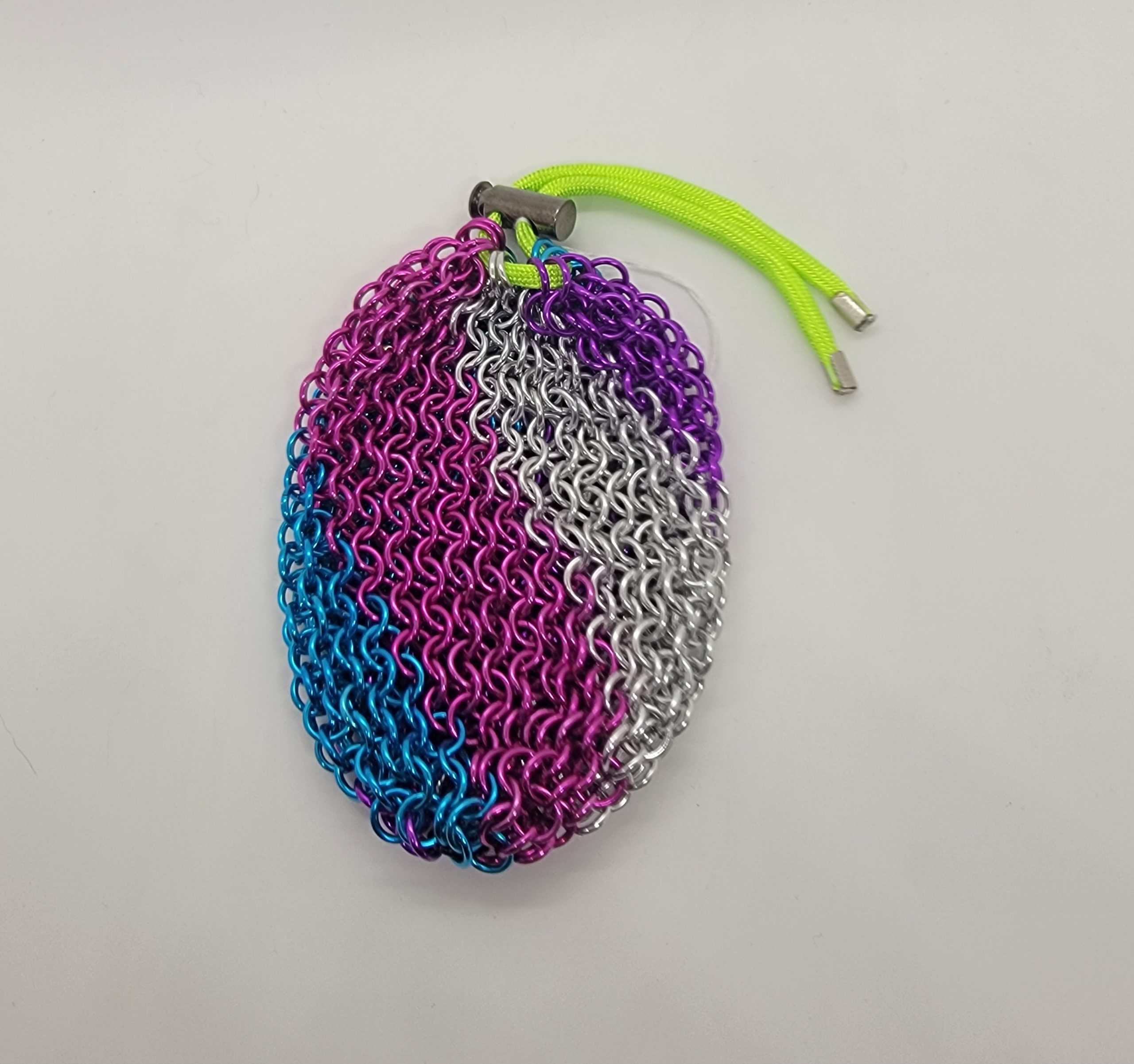 This chainmaille pouch strides in like it just stepped off an arcade carpet in 1987. Electric blue, hot magenta, ultraviolet purple, and chrome silver rings glow together in a retro pop of color, backed by a high-energy neon cord that looks ready to star in its own synth solo. Lightweight, durable, and unapologetically vibrant, it’s the perfect vault for dice that deserve to party like it’s peak neon era. 🎲💥🕹️. Constructed from hard temper anodized rings in a European 4-1 mesh. It comes with a durable paracord drawstring, metal cord lock, and metal cord ends. Holds approx. 30 standard polyhedral dice. *Dice not included